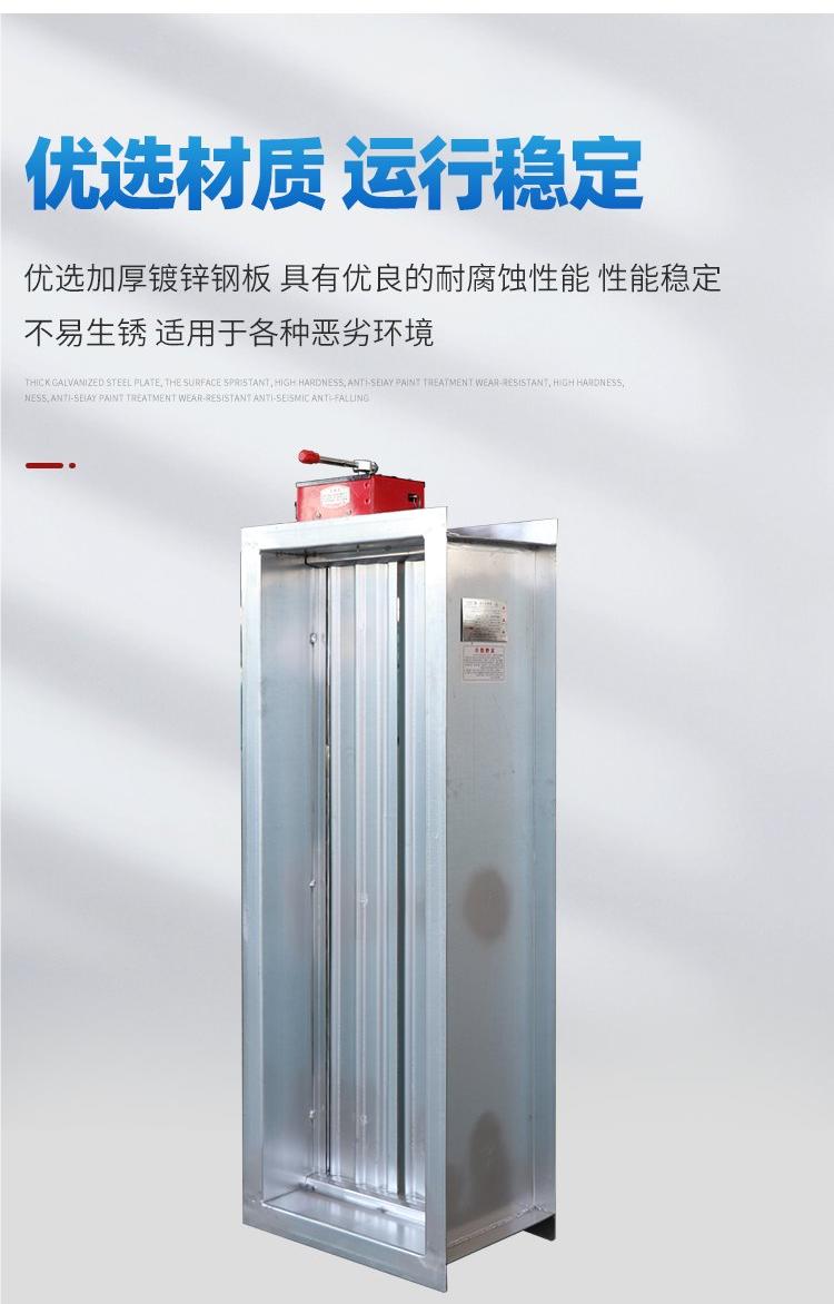 排煙防火閥是一種消防部件,一般安裝在機械排煙系統的管道上,平時呈開啟狀態,發生火災時開啟排煙,當排煙管道內煙氣溫度達到280度時關閉,并在一定時間內滿足漏煙量和耐火完整性要求,起隔煙阻火作用。主要材質:碳素鋼、鍍鋅板、不銹鋼。