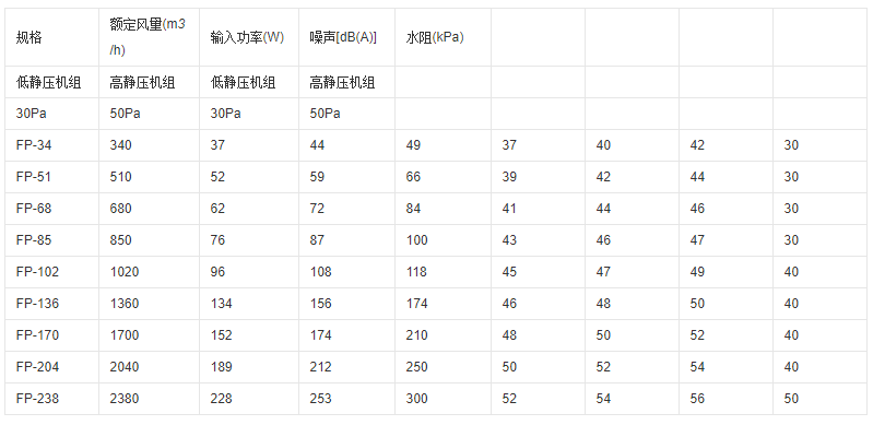 2.風(fēng)機(jī)盤管機(jī)組供氣量約為250 ~ 2500米/小時(shí),出口靜壓小于100帕(出口靜壓大于30帕為高靜壓型)。