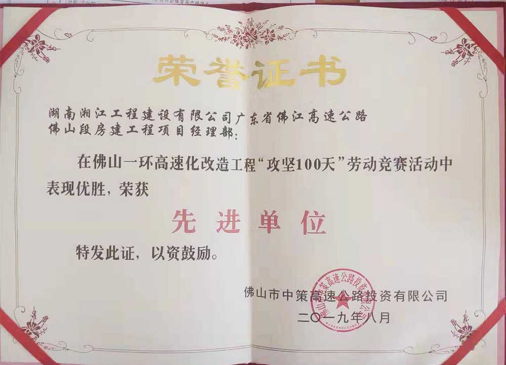 近期,由公司承建的佛山高速公路佛山段房建工程項目部在佛山一環高速化改造工程開展的“攻堅100天”勞動競賽活動中表現優異,以高質量的工作成績力超中國鐵建等三家參建企業,榮獲業主單位頒發的先進單位榮譽稱號..
