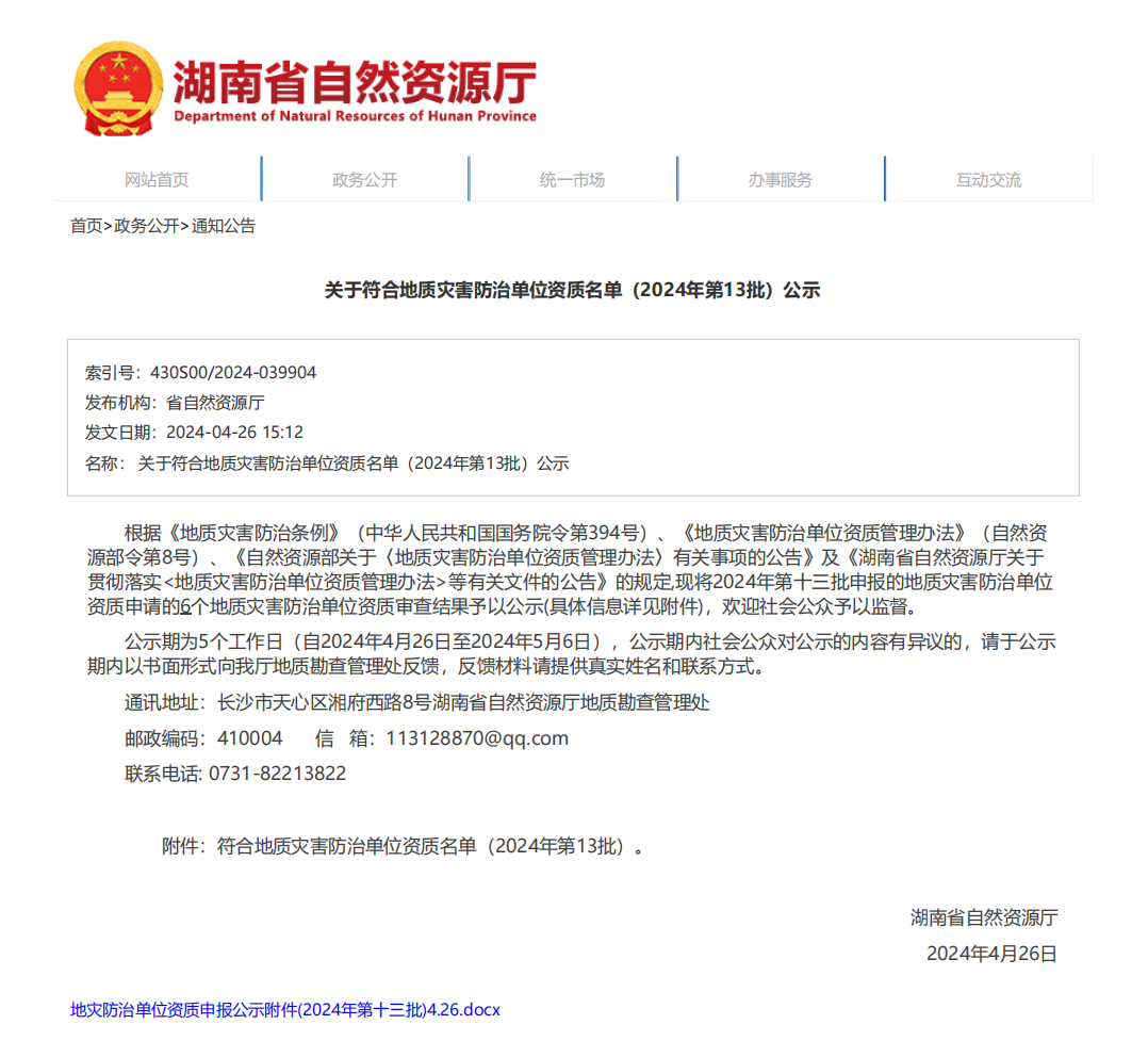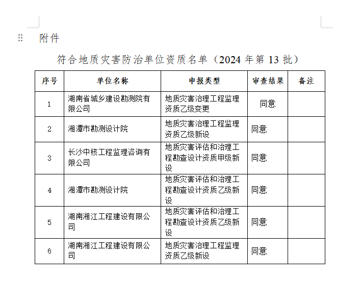 近日,湖南省自然資源廳公布了關于符合地質災害防治單位資質名單(2024年第13批)公示”,經資料審核、現場核實、專家評審,湘江公司順利取得地質災害評估和治理工程勘查設計、地質災害治理工程監理兩項乙級新設資質。在現有地質災害防治治理施工甲級的基礎上延伸了公司地災資質產業鏈,為地災業務開拓和多元化發展,以及向地質主業轉型奠定了堅實基礎。